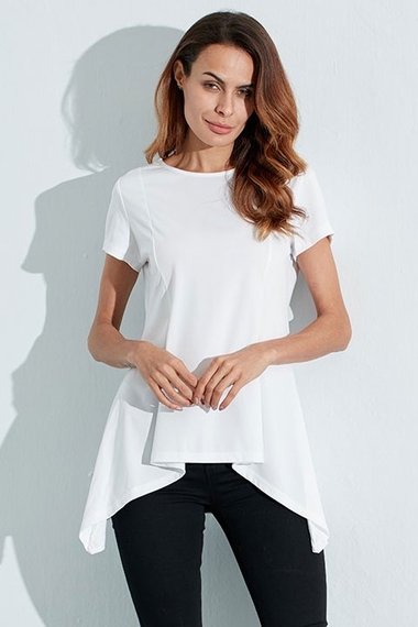 Белая туника с короткими рукавами, вытачками иудлиненным сзади подолом. Отличный вариант для жаркого лета!