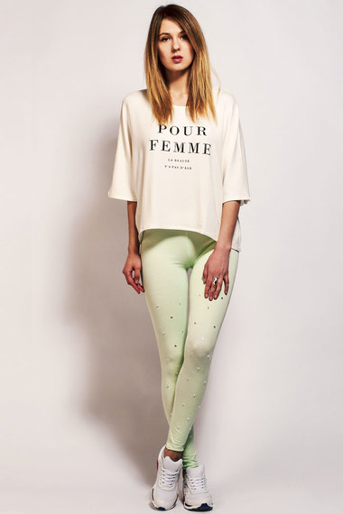 Тонкие легинсы с крупными стразами впереди. Выполнены в нежном фисташковом цвете.